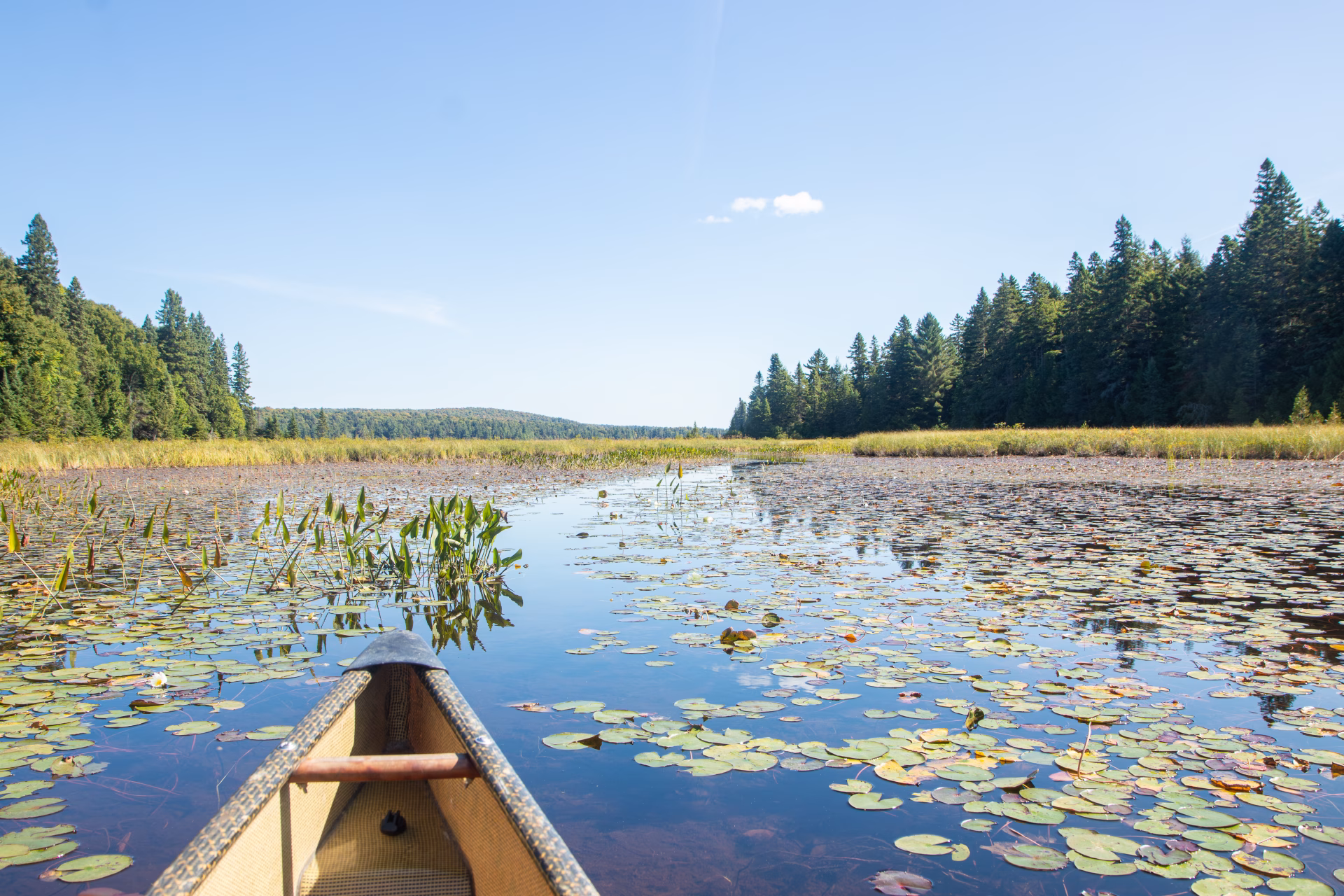 Une longue journée de canot nous attend aujourd’hui pour rejoindre notre prochain emplacement de camping. On plie le camp, laissant tout comme nous l’avons trouvé. Puis, à 10 h 30, on met le canot à l’eau et c’est parti pour une nouvelle journée d’aventure. On dit au revoir à Rence Lake qui nous a accueillis pour la nuit et c’est par une rivière étroite que nous rejoignons le lac suivant. L’endroit est magnifique, avec ses eaux peu profondes, ses algues grouillant de vie, ses nénuphars en fleur et ses grenouilles qui nous regardent prudemment passer. Tout est paisible, et seul le clapotis de l’eau sous nos pagaies se fait entendre.